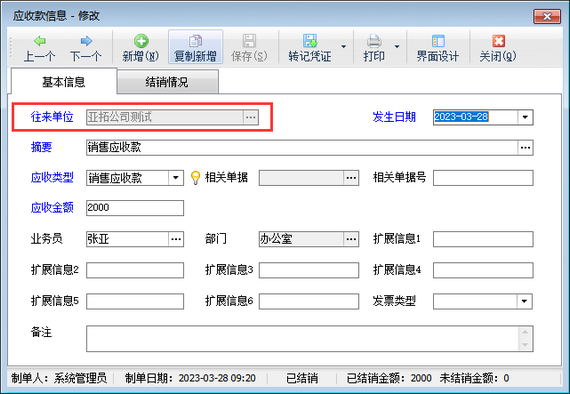 如修改應(yīng)收款信息時無法修改往來單位名稱,原因是此應(yīng)收款信息已存在結(jié)銷記錄,如需修改應(yīng)收款往來單位名稱,需紅沖(刪除)已存在的結(jié)銷記錄,然后即可修改應(yīng)收款信息的往來單位名稱。