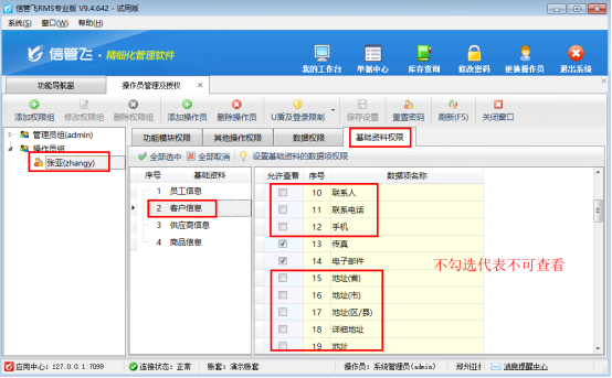 在「系統(tǒng)管理」→「操作員及授權(quán)」中,選擇需要設(shè)置的操作員,進(jìn)入“基礎(chǔ)資料權(quán)限”模塊,逐項(xiàng)取消勾選禁止查看的字段。