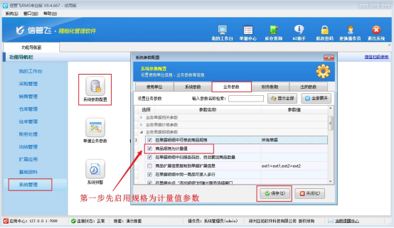 打開軟件,進入系統參數設置界面,找到“商品規格為計量值”這一選項,輕輕勾選。這一小小的操作,就像是為軟件開啟了一扇通往便捷計量的大門,為后續的精準計算奠定基礎。具體操作步驟可參考下方圖示: