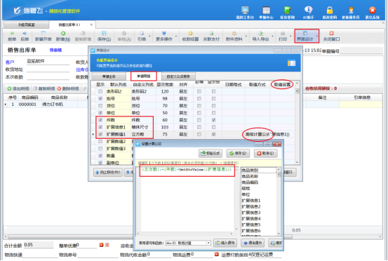 2、在單據(jù)明細(xì)下的默認(rèn)列名中找到“擴(kuò)展數(shù)值1”,自定義列名為“立方數(shù)”,并設(shè)置取值方式為“高級計算公式”,取值設(shè)置為:{立方數(shù)} :={件數(shù)}*GetStrValue({擴(kuò)展信息1}),即立方數(shù)=件數(shù)*箱體尺寸。