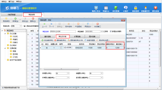 在軟件功能導航窗點擊“基礎資料”—》“商品信息”,即可打開“商品信息”界面。選擇需要設置的商品,點擊“修改”按鈕,在“單位及價格”標簽頁中,可直接設置該商品的“最低售價”(同時可同步設置“最高采購價”,實現采購、銷售雙向價格管控)。