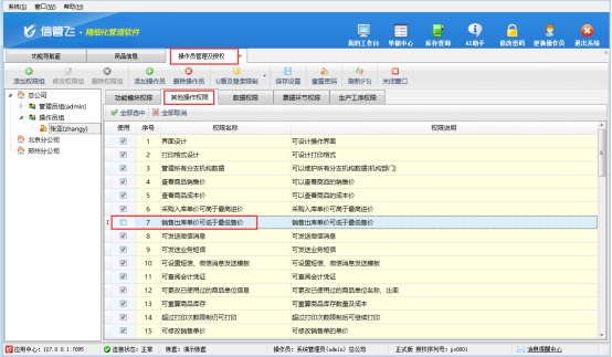 在功能導航窗點擊“系統管理”—》“操作員及授權”,進入“操作員管理及授權”界面,選擇對應操作員賬號(如“張亞”),在“其他操作權限”界面中,將“銷售出庫單價可低于最低售價”權限勾選取消,保存權限設置即可。