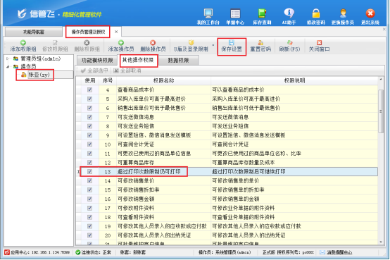 在日常開單過程中,操作員可能會遇到這樣的困擾——已打印過的單據需要修改后重新打印時,系統卻提示超出打印次數限制,導致無法再次打印,既影響效率又讓人著急。別擔心,信管飛軟件為您提供了簡單有效的解決方案! 方案一:給操作員開通特權 一、進入授權界面